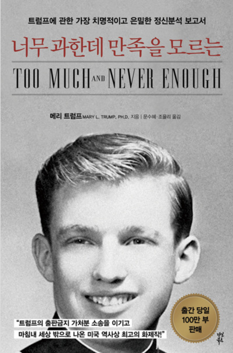 유난히 내가 좋아하는 종류의 글을 쓰는 미국인들이 쓴 산문을 읽을 때마다 “2016년 11월 9일”의 공기를 묘사하는 장면을 자주 마주하게 된다는 걸 깨달은 적이 있다. 그들은 2016 미국 대선 다음날을 선명하게 기억할 수밖에 없다. 도널드 트럼프가 대통령인 시대에 차별받고 배제된 자들은 자신의 언어를 벼려내고, 그 시간을 어떻게 통과했는지 이야기로 들려준다. 올해 영화 <어프렌티스: 트럼프의 탄생>이 아카데미 시상식 남우 주연/남우 조연상에 지명된 것을 계기로, 트럼프에 대한 영화를 보게 된 김에 도널드 트럼프의 유일한 여조카 ‘메리 트럼프’가 쓴 <너무 과한데 만족을 모르는(too much and never enough)>까지 읽게 됐다. 이 책은 제목 그대로 자신의 삼촌 도널드 트럼프가 성장기부터 차곡차곡 갖추어 온 괴팍한 심성의 근원을 살핀다. 이토록 방대한 정신분석 보고서를 완성하고, 도널드 트럼프의 출판 금지 가처분 소송에도 불구하고 출간까지 해낸 메리 트럼프의 긍지에 박수를 보낸다.